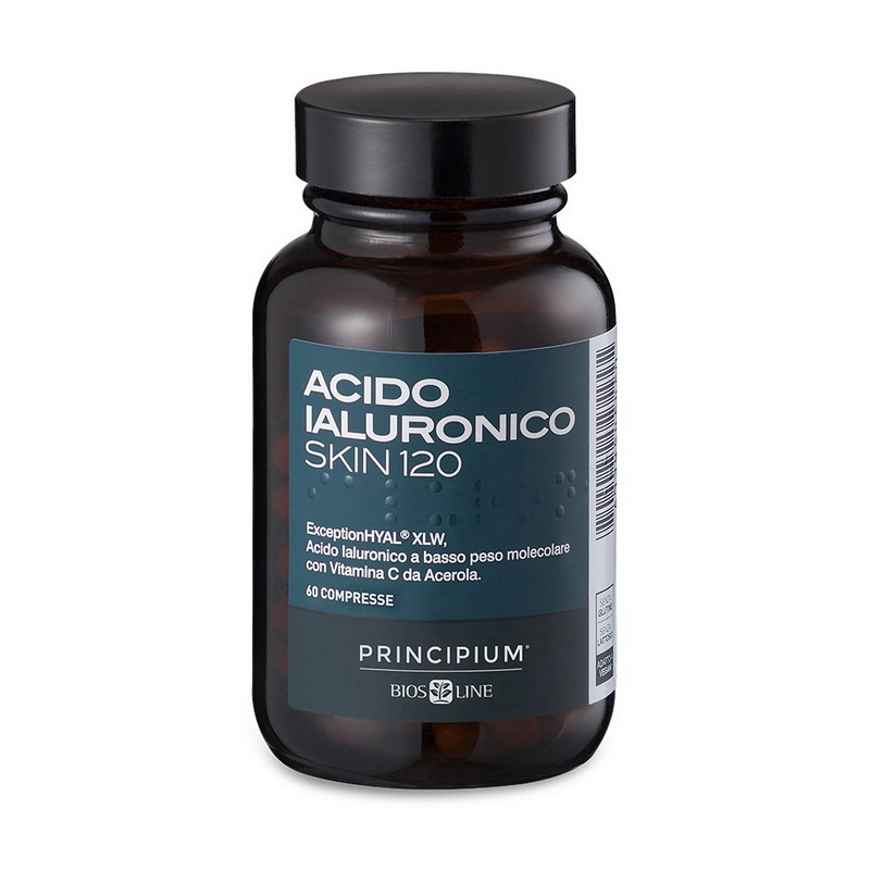 Principium Acido Ialuronico Skin 120 от Bios Line – это пищевая добавка с ExceptionHYAL® XLW, низкомолекулярной гиалуроновой кислотой растительного происхождения, которая быстро всасывается в кишечнике. Добавка также содержит ExceptionHYAL® MW, гиалуроновую кислоту средней молекулярной массы и витамин С из ацеролы, которые способствуют образованию коллагена для нормальной функции кожи.
