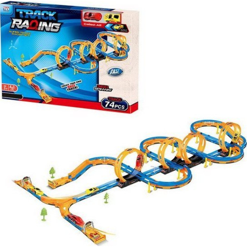 Комплектація: У наборі є 74 елементи, включаючи дороги, повороти, містки, перешкоди та інші деталі, які допоможуть створити різноманітні конфігурації трас.