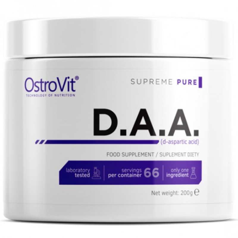 OstroVit D.A.A. спортивна харчова добавка, що містить D-аспарагінову кислоту, збагачену таурином. Препарат значно підвищує рівень тестостерону в організмі. D.A.A. є унікальним препаратом завдяки дуже високому вмісту D-аспарагінової кислоти - 98%. Препарат поставляється у вигляді порошку, що сприяє його швидкому засвоєнню.