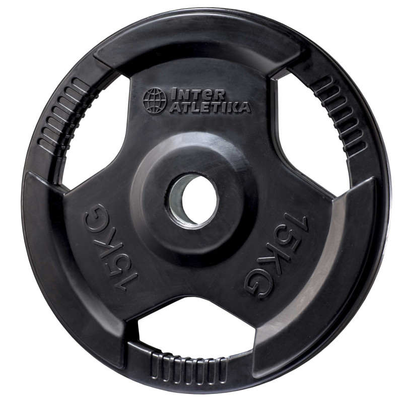 Диск InterAtletika LCAH-M гумовий з ручками призначений для зміни ваги штанги або гантелі. Використовується в поєднанні з цими снарядами, також можна застосовувати як обтяжувач замість гантелі. Щоб диск не сковзнув грифа під час тренування, рекомендується надійно його фіксувати. Диск має ручки для зручнішого перенесення та одягання їх на штангу або гантель. Завдяки обрізаному верхньому шару, диск не зіпсує покриття для підлоги, тренажери або стіну при падінні.