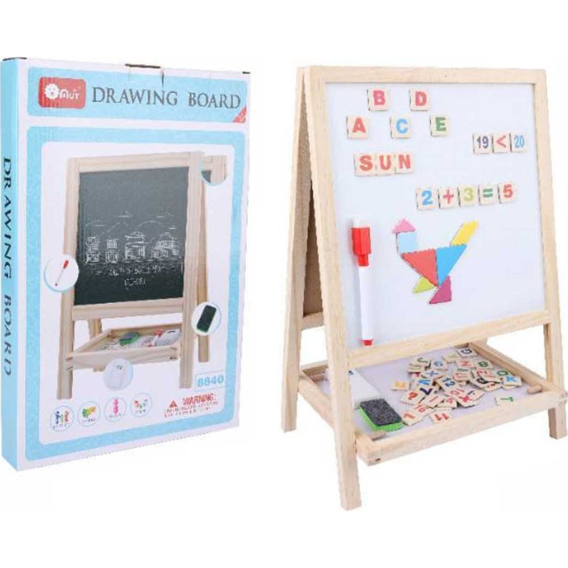 Двостороння дерев'яна дошка - ідеальна розвиваюча іграшка для дітей від 3 років , яка дозволяє розвивати образотворчі та математичні навички. Дошка має дві поверхні - білу , призначену для малювання фломастером, і чорну сторону, на якій можна малювати крейдою.