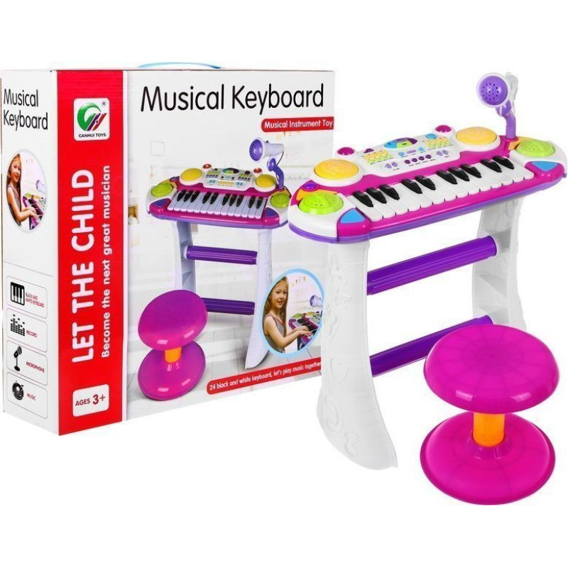 На столику з клавіатурою діти також отримують мікрофон на підставці для співу та багато інтерактивних функцій. Музична клавіатура складається з 24 білих і чорних клавіш , тобто 2 октави. З боків 2 динаміки хорошої якості .