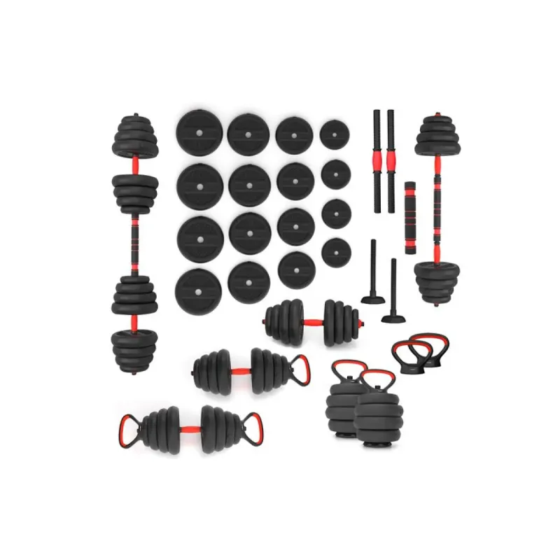 SGN130 PRO SET 6IN1 WEIGHT SET 30KG HMS SGN 6в1 Це революційний продукт від HMS, який дозволяє виконувати кілька силових вправ з одним комплектом обладнання. SGN 6w1 складається з шістнадцяти пластин, двох коротких грифів, одного подовжувача грифів, двох ручок і двох підставок для гир і затискачів. Ви можете використовувати їх для створення наступних інструментів: