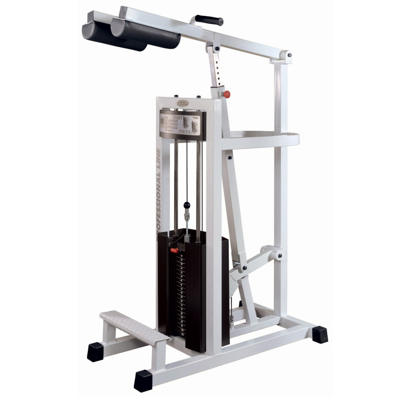 Тренажер призначений для виконання підйому на носок. Початкове положення – стоячи, ноги на підставці, опорні валики на плечах, руки лежать на власниках. Виконати підйом на носок і повернутися в початкове положення.