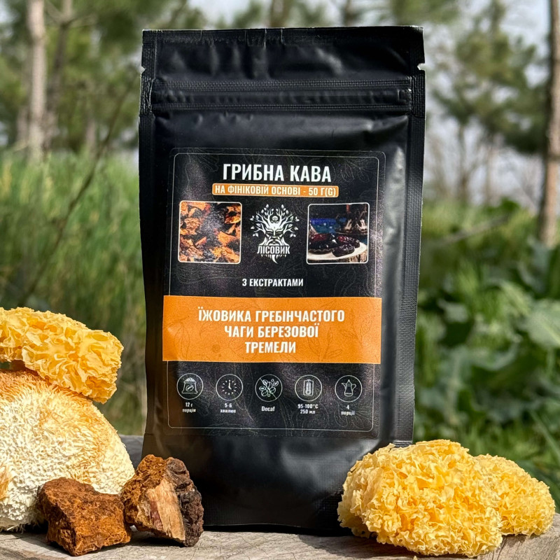 Грибна кава на фініковій основі від Лісовик, 50 грам — це сучасна альтернатива класичній каві без кофеїну, створена на базі натуральної фінікової кави, функціональних грибів, катуаби та цейлонської кориці. Напій поєднує традиції використання грибів у східній медицині та сучасний підхід до функціонального харчування. Фінікова основа надає м’який шоколадно-карамельний смак, а грибні екстракти доповнюють його підтримкою енергії, концентрації та імунітету без перевантаження нервової системи.