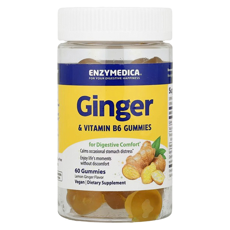 Ці зручні та смачні м'які жувальні цукерки поєднують у собі вітамін В6 зі свіжим органічним коренем імбиру, який допомагає полегшити нудоту.