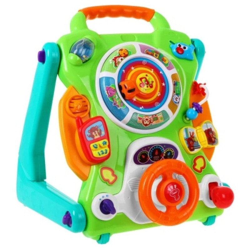 Другий варіант - трансформувати іграшку в зручний навчальний столик з інтерактивною панеллю у верхній частині. Це пропозиція для трохи більших дітей, які вже можуть стояти самостійно . Сенсорна дошка має цілих 8 міні-ігор , які стимулюватимуть почуття вашої дитини. У верхній частині є обертовий циліндр з брязкаючими кульками , ковзаючий літачок, що видає звуки польоту, і велика звукова дошка з рухомою машиною . З боків можна побачити маленьке сенсорне переплетення з намистинами, рухливу книжку та знімний телефон із кнопками. У самому низу знаходиться кокпіт іграшкової машинки з перемикачем, важелем коробки передач, що видає звуки, і великим кермом із звуковим сигналом .