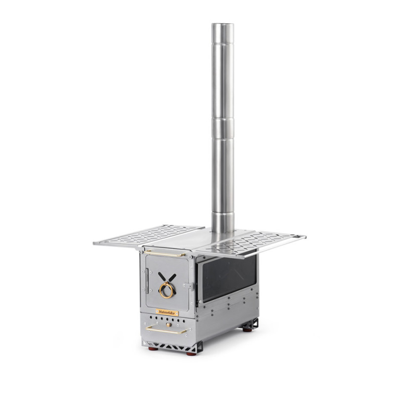 Для роботи печі використовуються дрова, які закладаються через бічні дверцята з ручкою-кільцем. На двох складаних підставках легко розмістити туристичний посуд чи харчові продукти. У такий спосіб ви можете одночасно кип'ятити воду, готувати гарячі страви та запікати овочі. Імпровізовані ручки на підставках дозволяють підвішувати дрібне приладдя, додаючи зручності під час готування та дозволяючи тримати все необхідне під рукою.