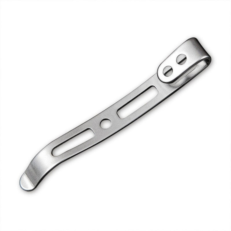 Матеріал — нержавіюча сталь, стійка до зношування та корозії. Довжина затискача сягає 5.8 см, а його дизайн перешкоджає чіплянню за рукави одягу у разі кріплення ножа на поясі або кишені штанів.