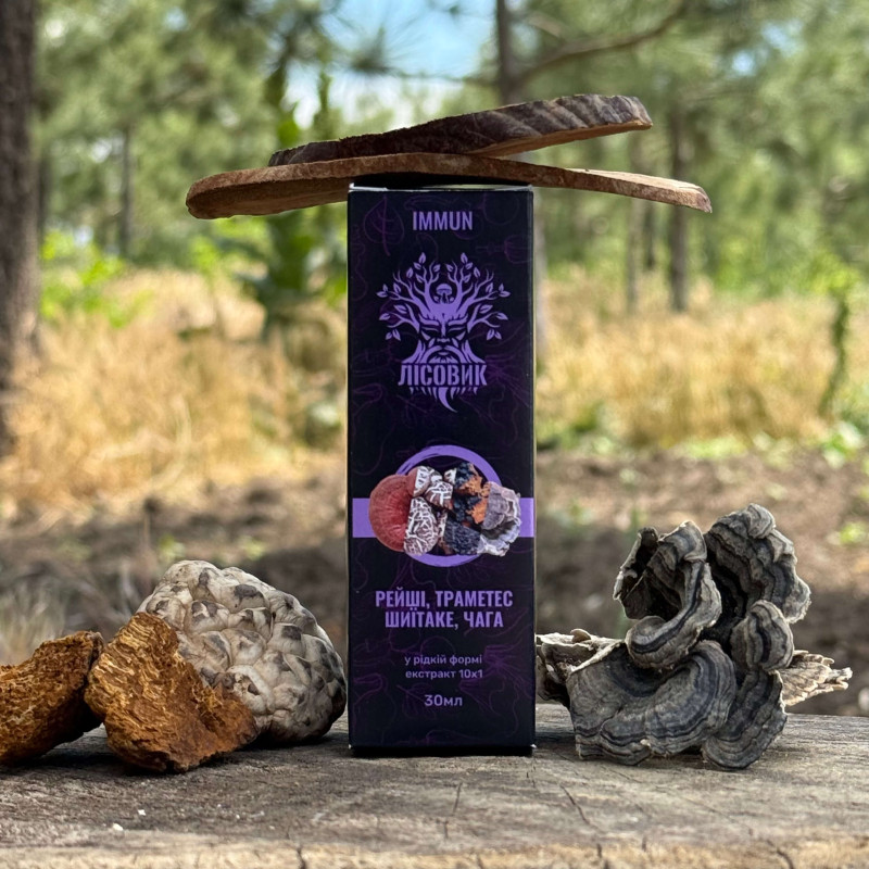 Комплекс IMMUN від "Лісовик" (30 мл) поєднує силу чотирьох відомих лікувальних грибів, які століттями використовувалися в традиційних системах оздоровлення Азії та Європи. До складу входять чага, рейші, шиїтаке та траметес — гриби, що ростуть у природних лісових екосистемах і відомі високим вмістом бета-глюканів, полісахаридів та антиоксидантів. Рідка форма екстракту забезпечує швидке засвоєння активних речовин і зручність щоденного застосування для підтримки імунітету та загального тонусу.