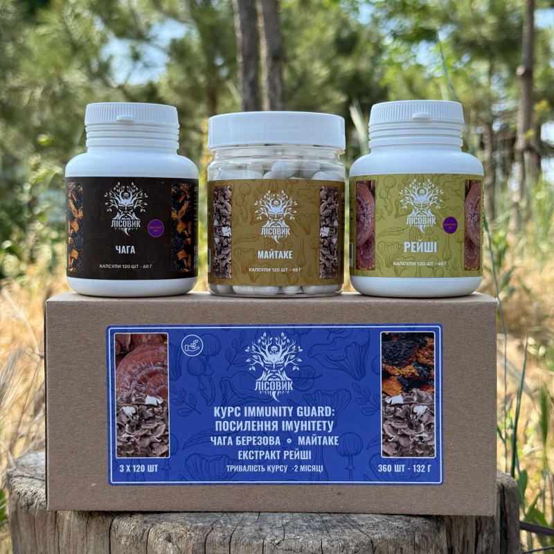 Курс Immunity Guard створений для комплексної підтримки імунної системи у періоди підвищеного навантаження на організм. Сучасний ритм життя, стрес, нестача відпочинку та вплив зовнішніх факторів поступово послаблюють природні захисні механізми. Саме тому у цьому курсі об’єднано три добре відомі функціональні гриби — рейші, майтаке та чагу. Кожен із них має власні корисні властивості, а разом вони формують збалансований комплекс для підтримки імунітету, енергії та загального самопочуття. Такий курс допомагає організму краще адаптуватися до щоденних навантажень та підтримувати природний баланс.