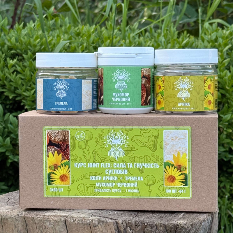 Курс Joint Flex створений для тих, хто хоче зберегти легкість рухів, гнучкість та комфорт у суглобах. У його основі поєднання трьох природних компонентів, кожен з яких має свою важливу роль у підтримці опорно-рухового апарату. Червоний мухомор традиційно цінують за здатність покращувати кровообіг та допомагати тканинам отримувати більше кисню і поживних речовин. Квіти арніки відомі своїми заспокійливими та відновлювальними властивостями, які допомагають підтримувати нормальний обмін речовин у тканинах. Доповнює формулу тремела — так званий «сніговий гриб», що славиться здатністю підтримувати еластичність тканин та сприяти природному відновленню організму. Разом ці компоненти формують курс, спрямований на підтримку гнучкості, рухливості та загального комфорту під час щоденної активності.
