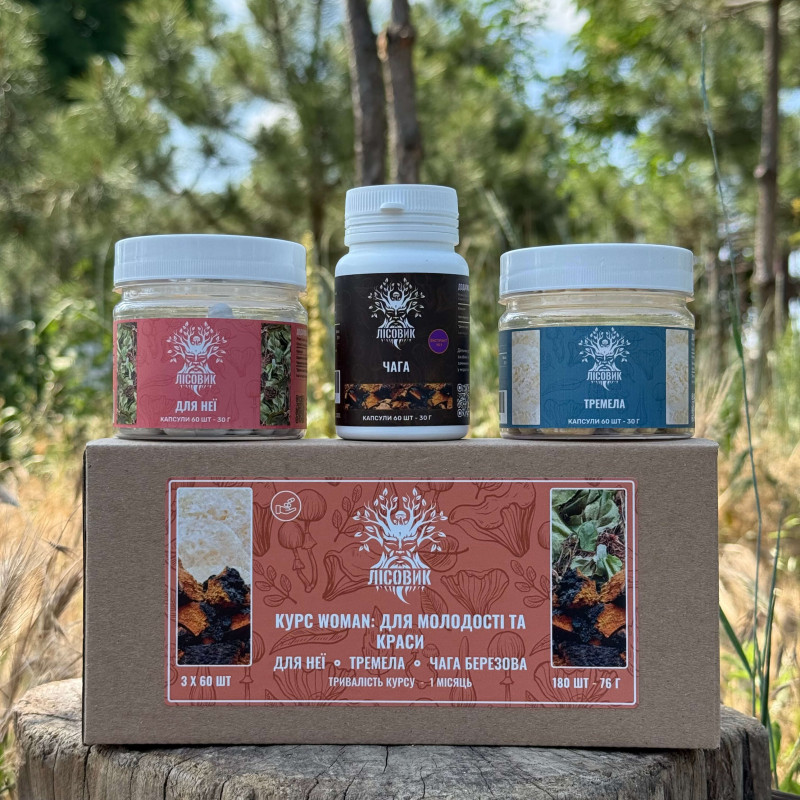 Цей курс створений як комплексна підтримка для жінки, яка хоче відчувати більше енергії, внутрішнього балансу та природної краси. До складу курсу входять три натуральні компоненти — чага, тремела та рослинний комплекс з червоної щітки і борової матки. Разом вони формують гармонійну систему підтримки організму: допомагають відновлювати сили, підтримують гормональний баланс, сприяють покращенню стану шкіри та загального самопочуття. Такий курс можна розглядати як природний внутрішній догляд, що працює не лише на зовнішню красу, а й на внутрішній комфорт і стабільність.