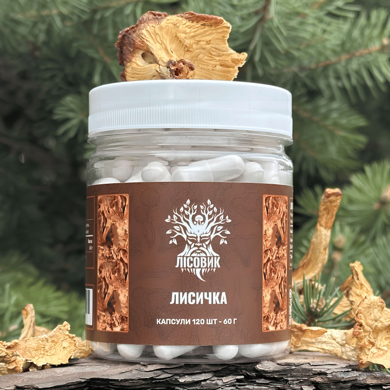 Лисичка справжня, "Лісовик", 120 капсул по 0,5 г - популярний лісовий гриб легко впізнати за яскравим золотисто-помаранчевим забарвленням і приємним кислуватим присмаком. Лисичка справжня зростає у хвойних та змішаних лісах, найчастіше великими родинами, утворюючи цілі «сонячні галявини» серед моху. Вона цінується не лише як смачний харчовий продукт, а й як джерело біологічно активних речовин. У висушеному вигляді її корисні сполуки максимально зберігаються, тому саме така форма є найбільш придатною для виготовлення капсул.