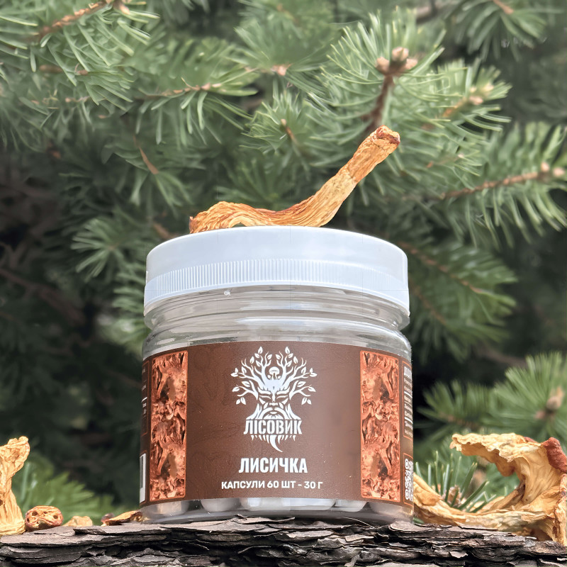 Лисичка справжня, "Лісовик", 60 капсул по 0,5 г - популярний лісовий гриб легко впізнати за яскравим золотисто-помаранчевим забарвленням і приємним кислуватим присмаком. Лисичка справжня зростає у хвойних та змішаних лісах, найчастіше великими родинами, утворюючи цілі «сонячні галявини» серед моху. Вона цінується не лише як смачний харчовий продукт, а й як джерело біологічно активних речовин. У висушеному вигляді її корисні сполуки максимально зберігаються, тому саме така форма є найбільш придатною для виготовлення капсул.