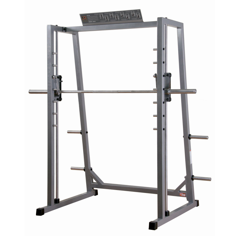 Механізм зчленування каретки з направляючими зібраний на 8-ми підшипниках виключають будь-який перекіс і забезпечують м'яке ковзання. Гриф забезпечений страхувальними крюками-зачепами, що забезпечують безпеку. Наявність штирів для дисків надає додаткову зручність під час тренування.