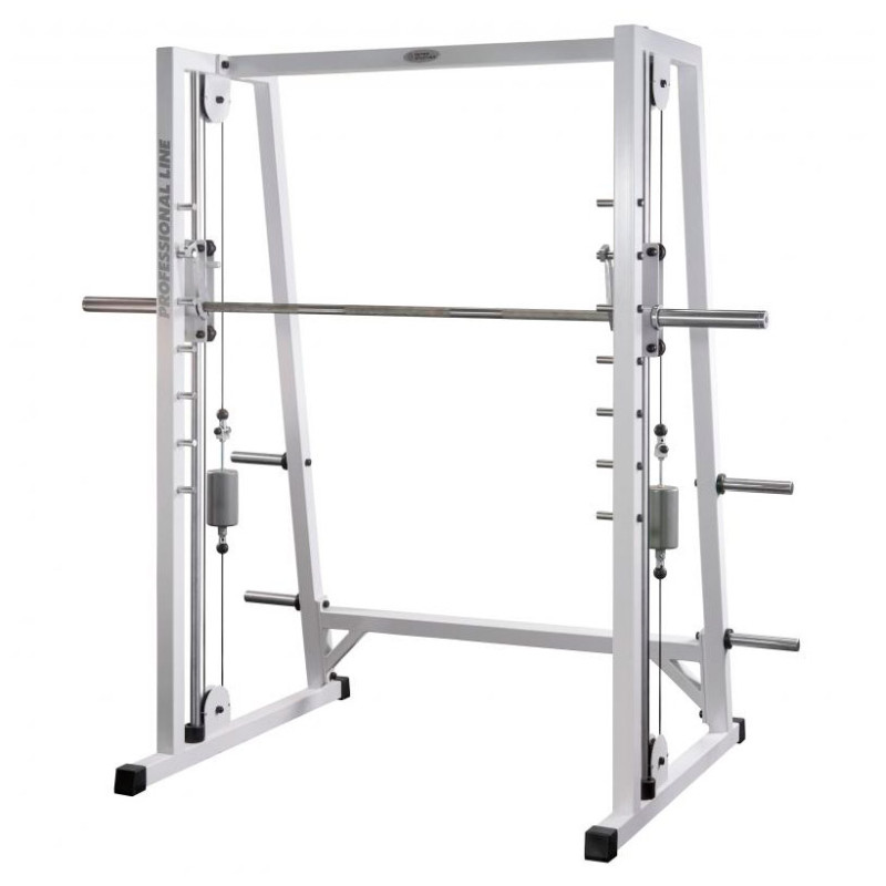 Гриф забезпечений страхувальними крюками-зачепами, що забезпечують безпеку. Наявність штирів для дисків надає додаткову зручність під час тренування. По універсальності " Машина Сміта" є досить привабливим тренажером. Приставивши регульовану лавку, на цьому тренажері досить комфортно можливе виконання різних жимів на м'язи грудей і верхнього плечового пояса.