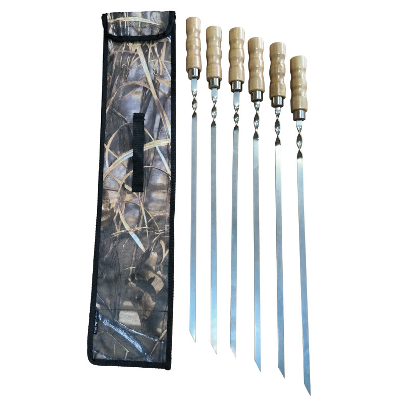 Вам не варто переживати, що вони деформуються після першого використання. Шампури вироблені з жаростійкого нержавіючого металу, який витримує високі температури. Вони зручні, практичні і довговічні. Шампури довжиною 60 см мають дерев'яну ручку, яка вбереже руки від опіків, з одного боку, інший бік оптимально загострений, що дозволяє без зусиль наживляти м'ясні вироби, овочі та інше. Набір із 6 шампурів комплектується чохлом з ручкою для максимально зручного зберігання та транспортування.