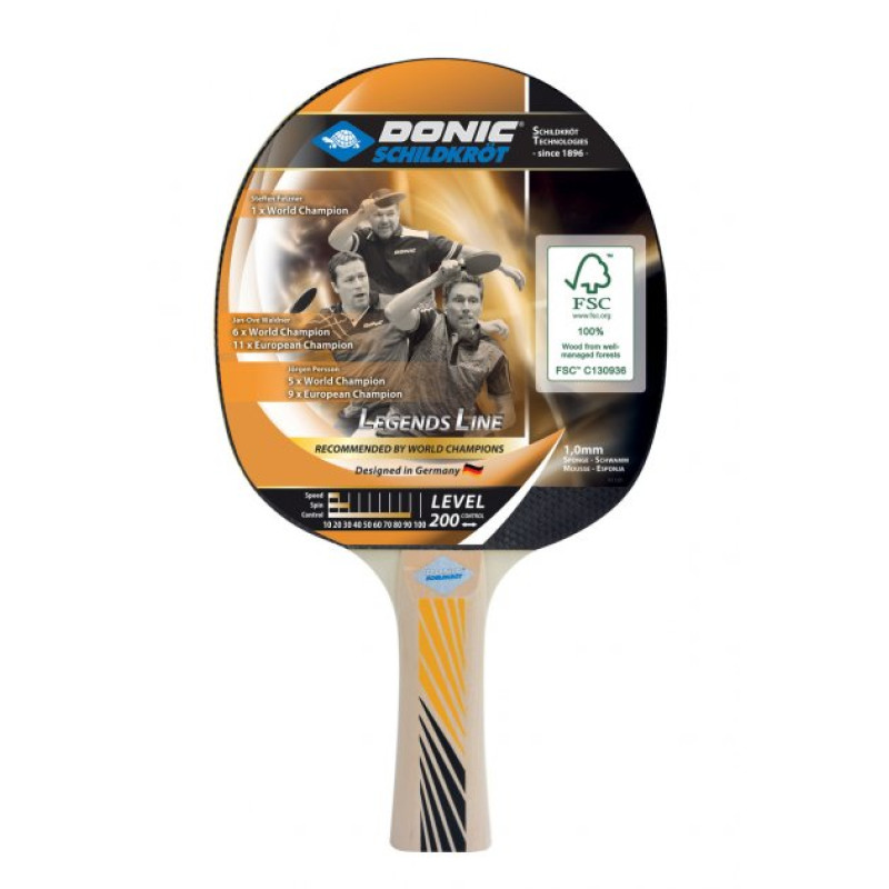 Donic Legends 200 FSC — ракетка для початківців, які тільки починають знайомство з настільним тенісом. Виконана з екологічно чистих матеріалів із сертифікацією FSC, що забезпечує високу якість і надійність.