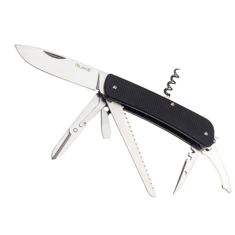 Не менш важливу функцію ніж ніж, грають і інші інструменти, вбудовані в Ruike L42. У нижній частині рукоятки розміщені пила по дереву, зменшені в розмірі ножиці, шило, дві прямі викрутки (мала і середня), стропоріз, відкривачку для пляшок, інструмент, зачищающий дроти від ізоляції. Із зворотного боку рукоятки можна дістати штопор. Ще два інструменту поміщені зі сторони торця – це склобій і невеликий кільце для підвішування до ножа темляка.