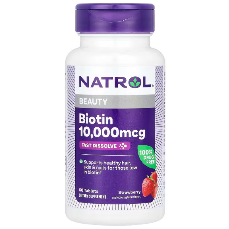 Биотин, Biotin, Natrol, клубника, 10000 мкг, 60 таблеток