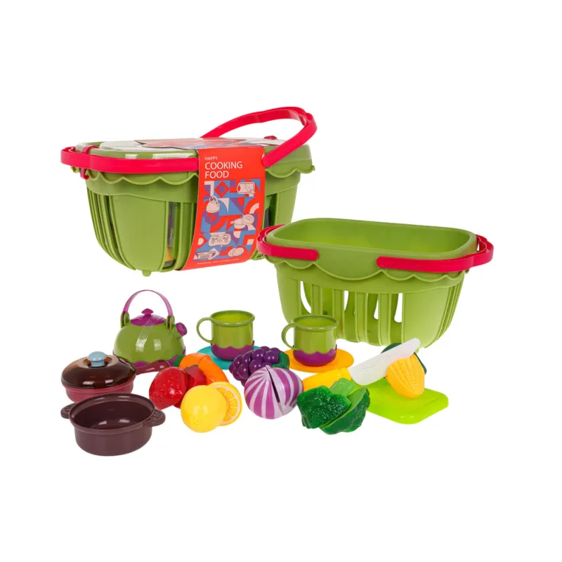У набір входить зручний кошик для пікніка , каструля з кришкою, сковорода , чашки , тарілки, чайник і обробна дошка з ножем . Найбільше приваблюють різнокольорові овочі та фрукти, які можна безпечно «розрізати» за допомогою липучок , що додає грі реалістичності.