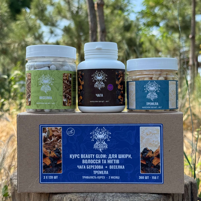 Курс Beauty Glow: для кожи, волос и ногтей (2 месяца), "Лесовик", 360 капсул - создан для комплексной поддержки красоты изнутри. Формула сочетает три грибные пищевые добавки — Чагу, Тремеллу и Весёлку — которые дополняют друг друга и работают в синергии. Курс рассчитан на 1 месяц приёма и направлен на улучшение состояния кожи, укрепление волос и ногтей, поддержание внутреннего баланса организма. Натуральные компоненты богаты антиоксидантами, полисахаридами, бета-глюканами, аминокислотами и другими биологически активными веществами, которые помогают организму восстанавливаться и сохранять молодость.