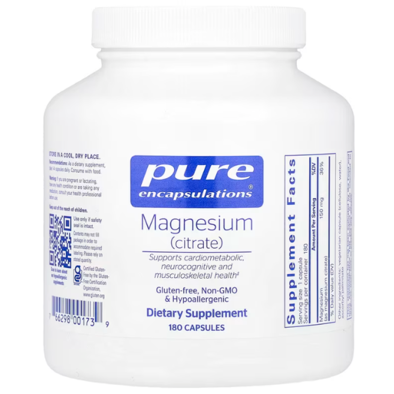 Магний цитрат, Magnesium (citrate), Pure Encapsulations, для сна, здоровья сердца, мышц и обмена веществ, 150 мг, 180 капсул