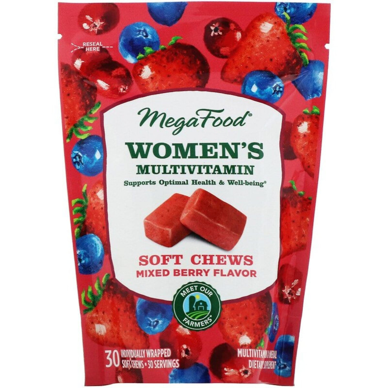 Мультивитамины для женщин, вкус ягод, Women's Multivitamin Soft Chews, Mixed Berry Flavor, MegaFood, 30 мягких жевательных конфет в индивидуальной упаковке