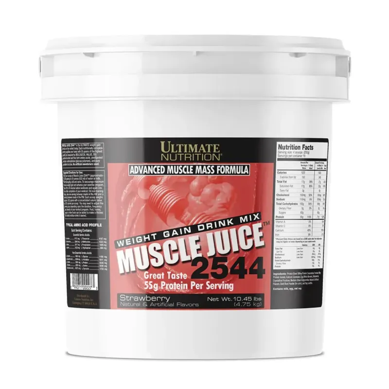 Всё просто! Muscle Juice 2544 это один из самых калорийных гейнеров с отличным вкусом на сегодняшнем рынке. Вместе с Muscle Juice 2544 Вы нарастите мышцы, ведь в формуле от Ultimate Nutrition содержится 55 г специальной протеиновой смеси (изолята сывороточного протеина, концентрат сывороточного протеина, казеинат кальция, яичный белок). Протеиновая смесь дает эффект медленного высвобождения питательных веществ в течение 6 часов, чтобы Ваши мышцы не нуждались в качественном питании. Растите мышцы! Порция включает 162 г углеводного комплекса высочайшего качества от Ultimate Nutrition, 17 г жиров, содержащих MCT (триглицериды со средней цепью), которые увеличат энергетический уровень и не будут при этом превращаться в подкожный жир. MCT дают длительный источник энергии и не поднимают уровень холестерина.