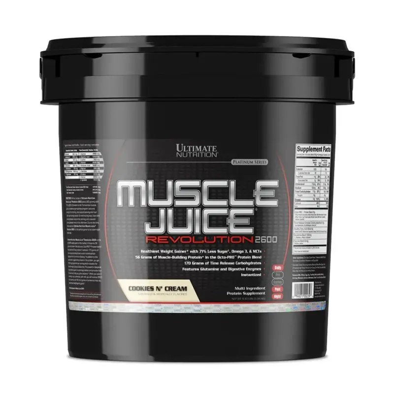 Ultimate Nutrition Muscle Juice Revolution 2600 – это ЛУЧШЕЕ средство для увеличения веса на рынке. Содержит 56 г белка в эксклюзивной белковой смеси Octo-PRO™, которая сочетает в себе 8 ключевых белков. Он содержит 170 г углеводов с задержкой высвобождения, что способствует перевариванию углеводов и минимизирует вздутие живота. В дополнение к предшественникам глутамин, присутствующих в этом протеине, вы получаете 1000 мг глутамин на порцию, которая включает революционный L-аланил-L-глутамин. Этот мощный дипептид может оградить от деградации мышц и обеспечить топливом для упражнений, чтобы помочь вам преодолеть дистанцию. Когда вы принимаете 2 порции в день, согласно инструкции с молоком, вы получите на 2600 калорий больше и 148 граммов белка больше, чтобы помочь вам превысить свои цели по увеличению веса. Протеиновая смесь, состоящая из нескольких источников белка, предпочтительнее любого источника с одним протеином для поддержания питания с длительным высвобождением. Сывороточные протеины, такие как гидролизат, изолят и концентрат, дают вашему организму приток аминокислот сразу после их потребления. Эти протеины отлично подходят для роста мышц.