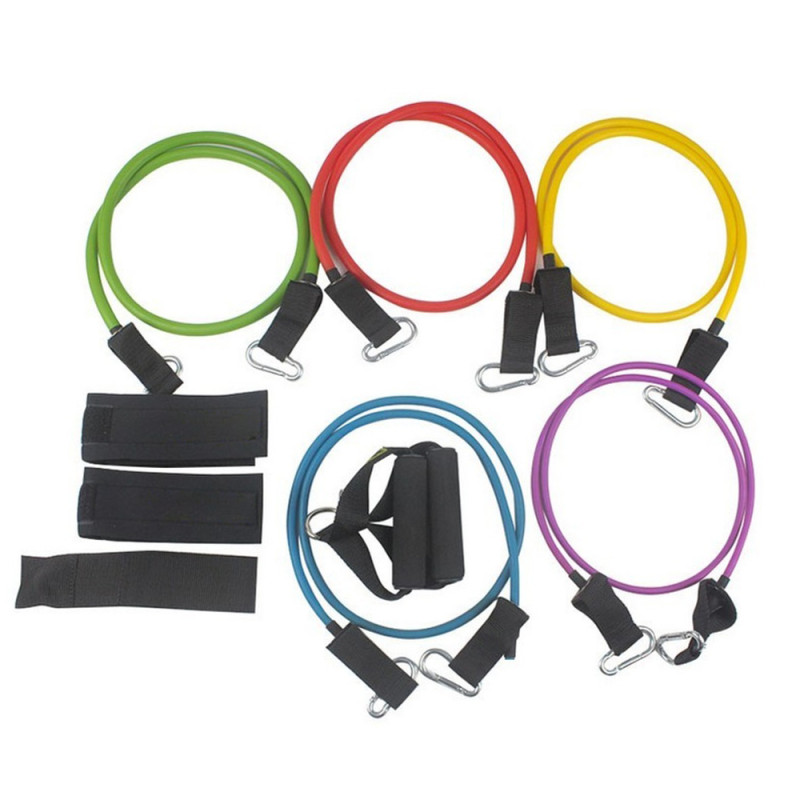 В основе набора пять эластичных трубчатых эспандеров с разным уровнем сопротивления: каждый уровень сопротивления представлен в разном цвете и размере. В зависимости от ваших потребностей, к ручкам можно прикрепить один или несколько эспандеров, уменьшая или увеличивая сопротивление. Суммарная нагрузка эспандеров: 30 кг.