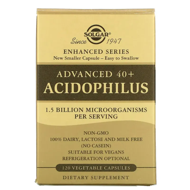 Растительные капсулы Улучшенный ацидофилус 40+ от Solgar являются источником полезных микроорганизмов L-ацидофилус, L-рамнозус, L-параказеи, B-лактис и C-термофилус. Этот продукт содержит известные штаммы LA-5, LGG, L. казей 431, BB-12 и TH-4, помогая поддерживать здоровую кишечную флору.