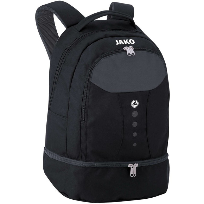 Рюкзак Jako Striker з функціональністю та спортивним дизайном. Велике основне відділення із двосторонньою блискавкою забезпечує достатньо місця для спортивного одягу, рушників та аксесуарів. Крім того, у рюкзак вбудовано окреме нижнє відділення, тут можна розмістити до двох пар взуття. Ключі, цінні речі та інші дрібні аксесуари можна розмістити в невеликій кишені з блискавкою в основному відділенні. Завдяки матеріалу, зробленому зі 100% поліестеру, за рюкзаком дуже легко доглядати. Точок тиску на тілі можна уникнути за допомогою м'яких ременів, а також м'якої та відшитої спинки.