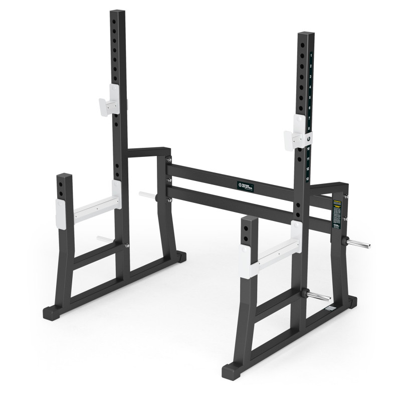 Стальная конструкция стоек имеет отличную устойчивость и прочность поскольку имеет основной профиль трубы 60х60х2,5 мм и усиленные метизы. Именно потому, рассчитана на интенсивные нагрузки, при этом обеспечивая максимальную безопасность и надежность во время тренировки. Стойка для штанги регулируется по высоте. Спортивный инвентарь имеет съемные ловушки для штанги, регулируемые страховочные ловушки. Оборудование дополнительно оснащено дискодержателями. Изделие покрыто порошковой эмалью, которая наносится способом электростатического напыления.