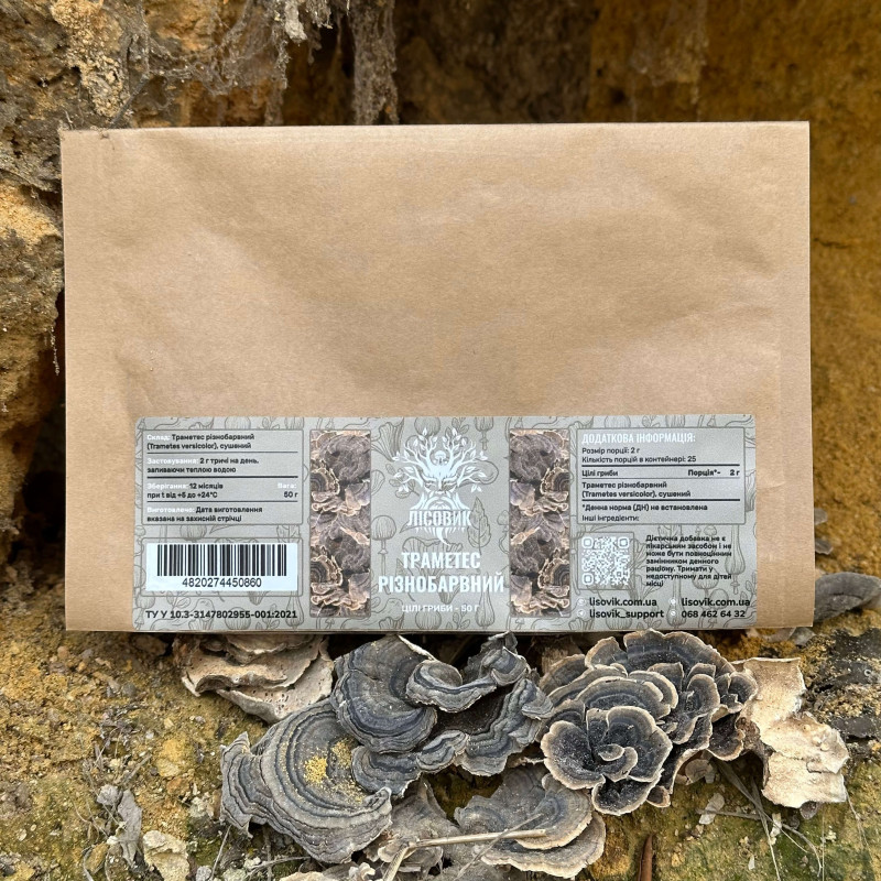 Траметес разноцветный, целые плодовые тела, "Лесовик", 50 грамм - натуральный гриб без измельчения и примесей, сохраненный в своем природном виде. Траметес один из самых мощных и ценных грибов, известный еще с давних времен в народной медицине Юго-Восточной Азии. Сегодня его ценят в Европе и Америке за уникальные свойства для поддержания иммунитета, энергии и когнитивных функций. Целые плодовые тела позволяют использовать гриб для самостоятельного измельчения или приготовления настоев и отваров.