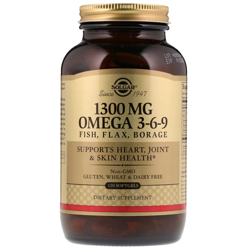 Омега 3-6-9 является смесью масел льняного семени, вечерней примулы, канолы, черной смородины и тыквенного семени. Данная формула от Solgar объединяет эти известные пищевые масла для создания сбалансированных пропорций жирных кислот Омега-3, Омега-6 и Омега-9. Омега-3, альфа-линоленовая кислота (ALA) и Омега-6, гамма-линоленовая кислота (GLA), играют важную роль в поддержании здоровой кожи и функции иммунной системы. Диетическая олеиновая кислота, мононенасыщенная жирная кислота Омега-9, поддерживает здоровье сердечно-сосудистой системы.