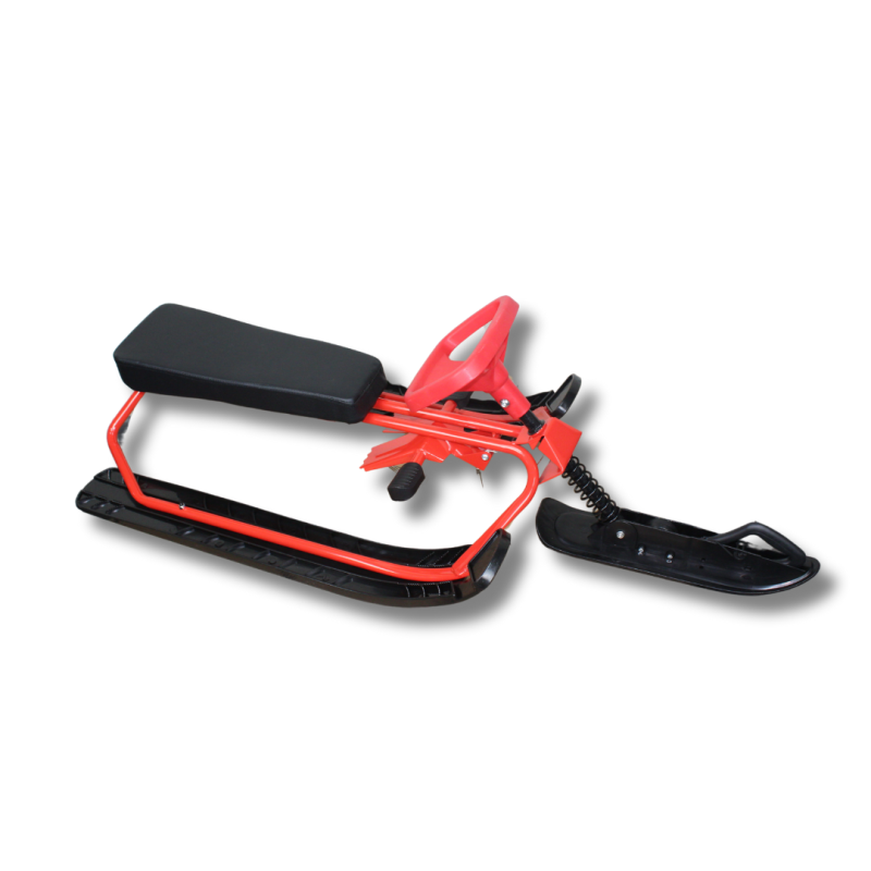 - Продумана конструкція. Міцна сталева рама, ножне гальмо та амортизатор забезпечать стабільність на поворотах. Широкі лижі з морозостійкого пластику із загнутими краями, допомагають легко долати перешкоди на снігових схилах.