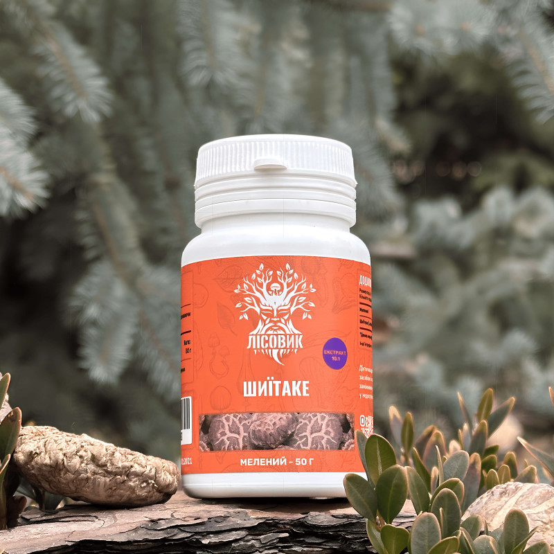 Шиїтаке, екстракт 10:1, мелений, "Лісовик, 50 грам — один із найвідоміших лікувальних грибів Азії, що природно росте на деревині листяних порід у Японії, Китаї та Кореї. Ще у стародавньому Китаї його називали «грибом імператорів» і використовували для підтримки життєвої енергії, відновлення після хвороб і довголіття. Сучасні дослідження підтверджують наявність у шиїтаке бета-глюканів, амінокислот і антиоксидантів.