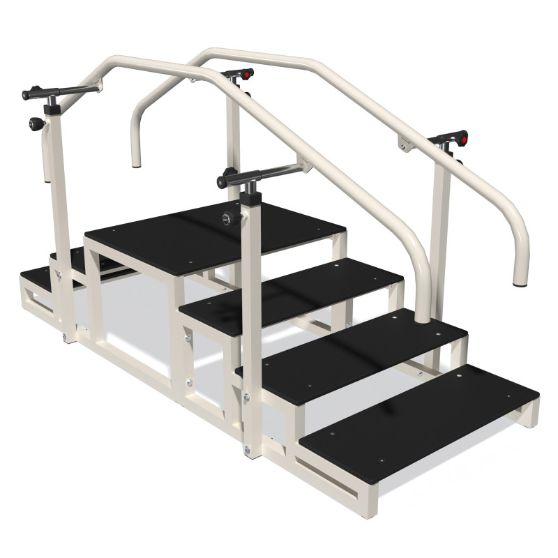 Дана модель реабілітаційних сходів оснащена поручнями, які забезпечують додаткову опору та безпеку в ході тренування. Висота поручнів регулюється по висоті для кожної людини індивідуально. Обладнання підходить для людей різного віку та рівня фізичної підготовки, що робить його універсальним інструментом в процесі реабілітації.